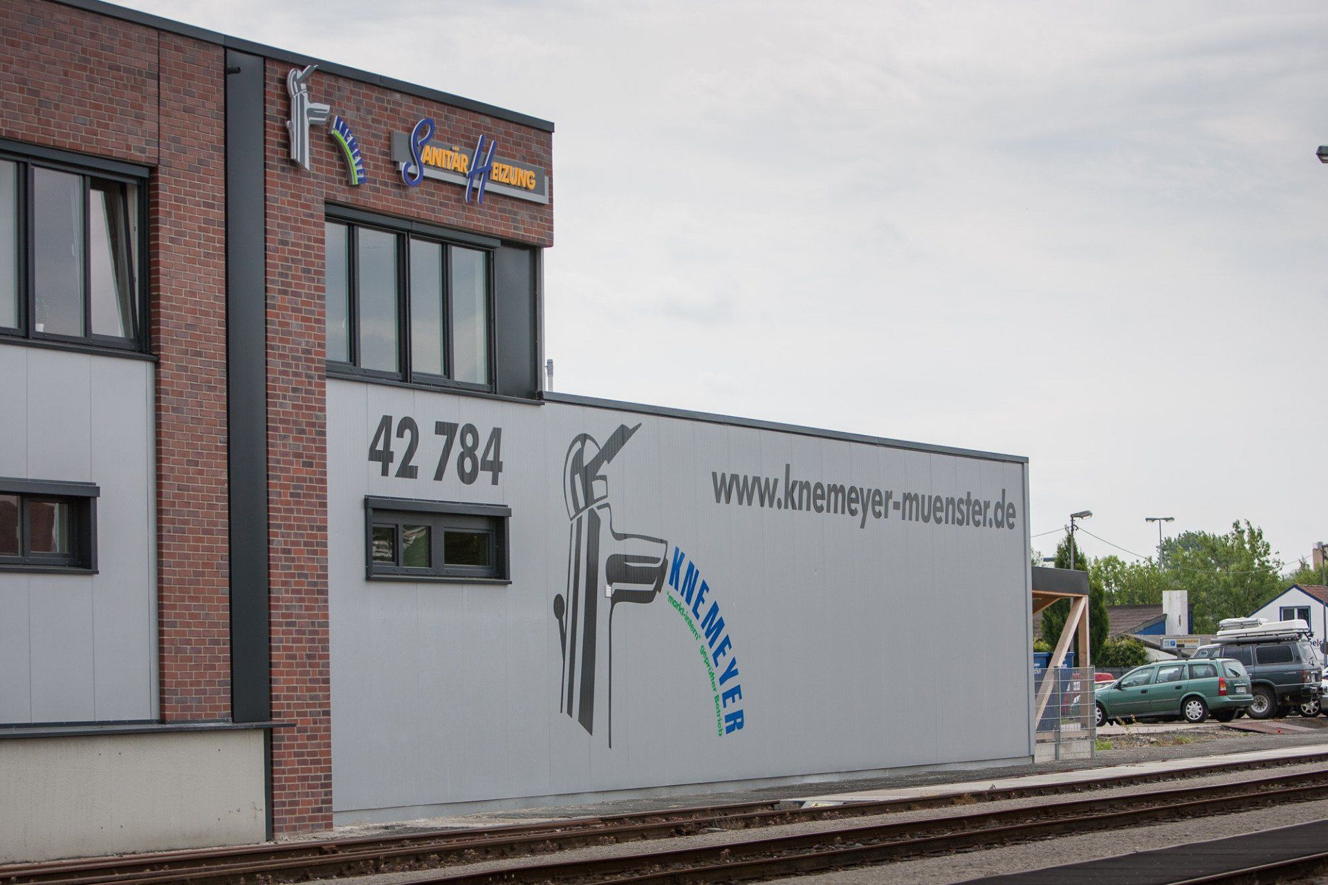 Umsetzung der Fassadenbeschriftung von Sanitär & Heizung Knemeyer am neuen Firmenstandort Lippstädter Straße.