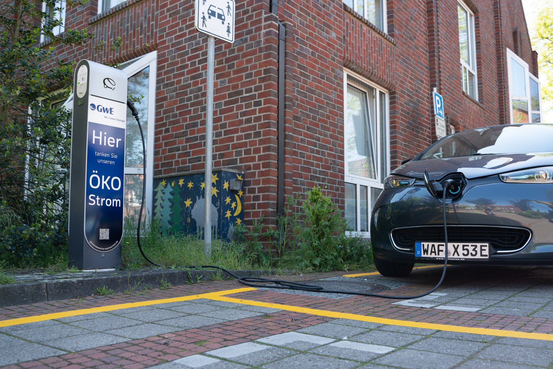 Layout und Kampagne für die Folierung von Kfz-Ladesäulen im Corporate Design der GwE an div. Standorten im Ortsbild von Everswinkel - Ausführung als Digidruck auf Reflexträgerfolie, somit auch in der Dunkelheit gut sichtbar.