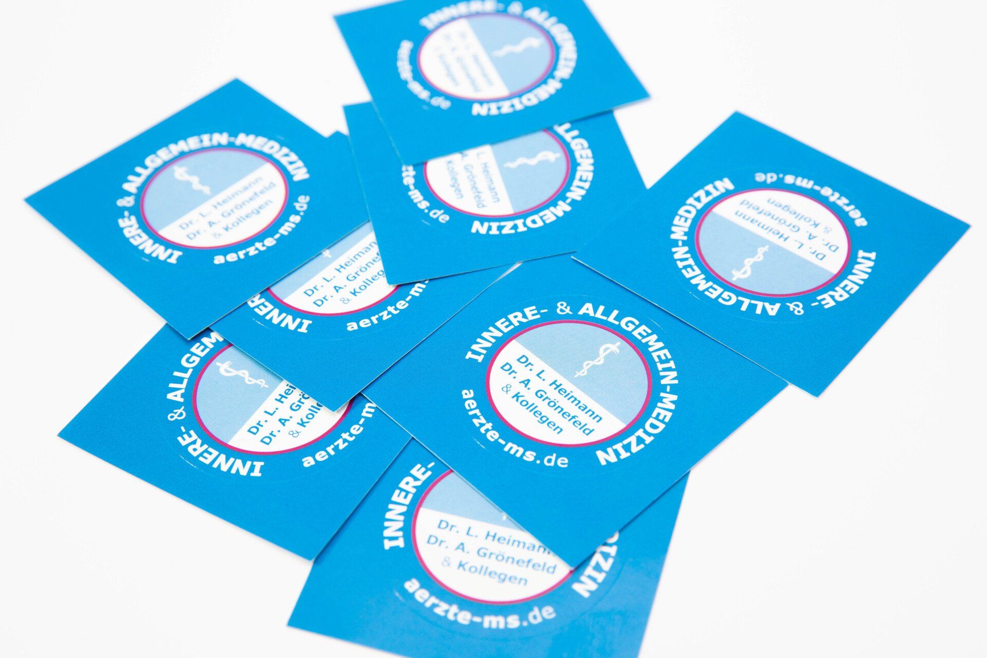 Buttonzur Labelung von Praxismaterial und Give-Aways.