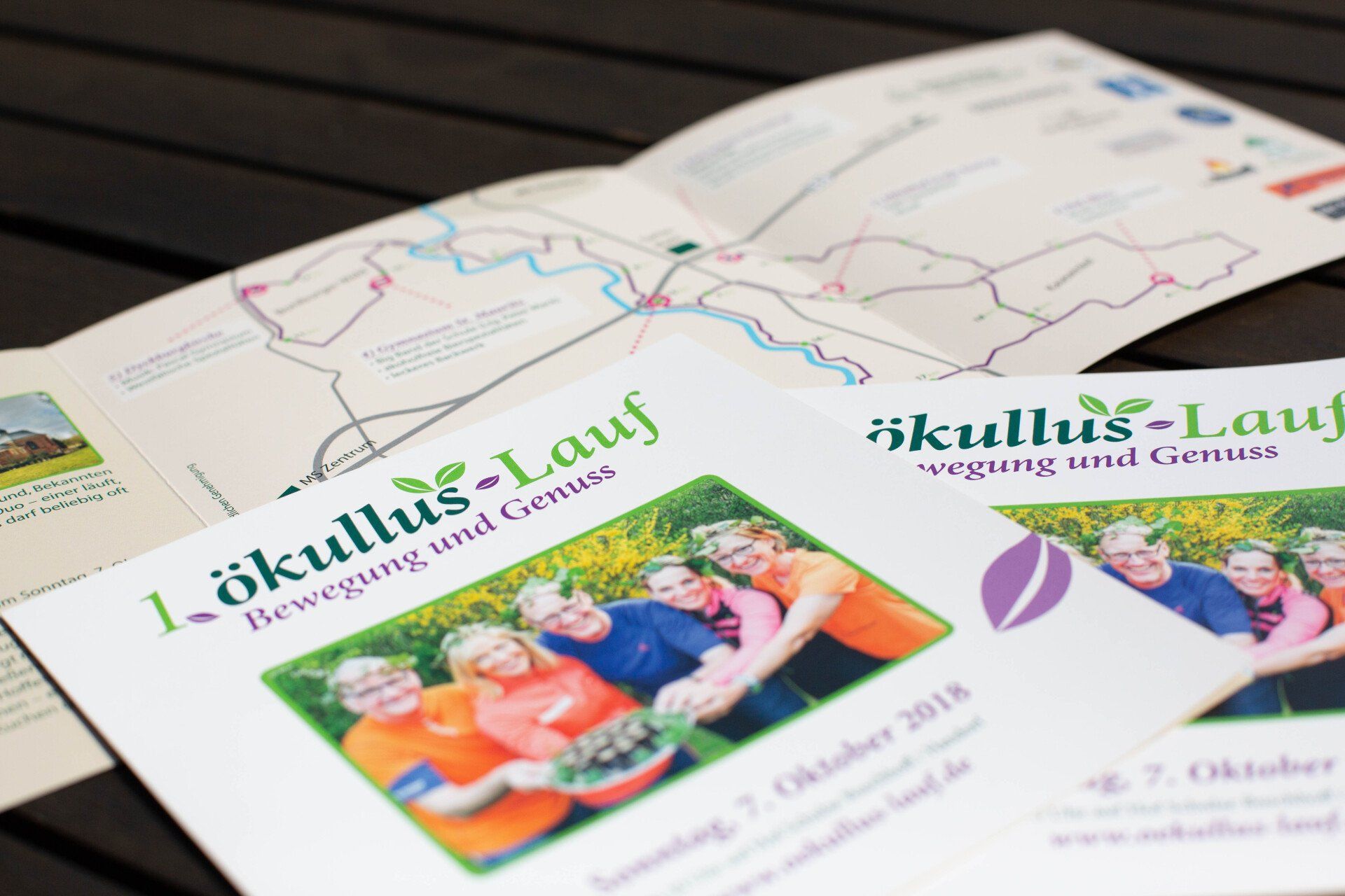Button6seitig quadratischer Werbeflyer für den Ökullus-Lauf inkl. Wegeplan.